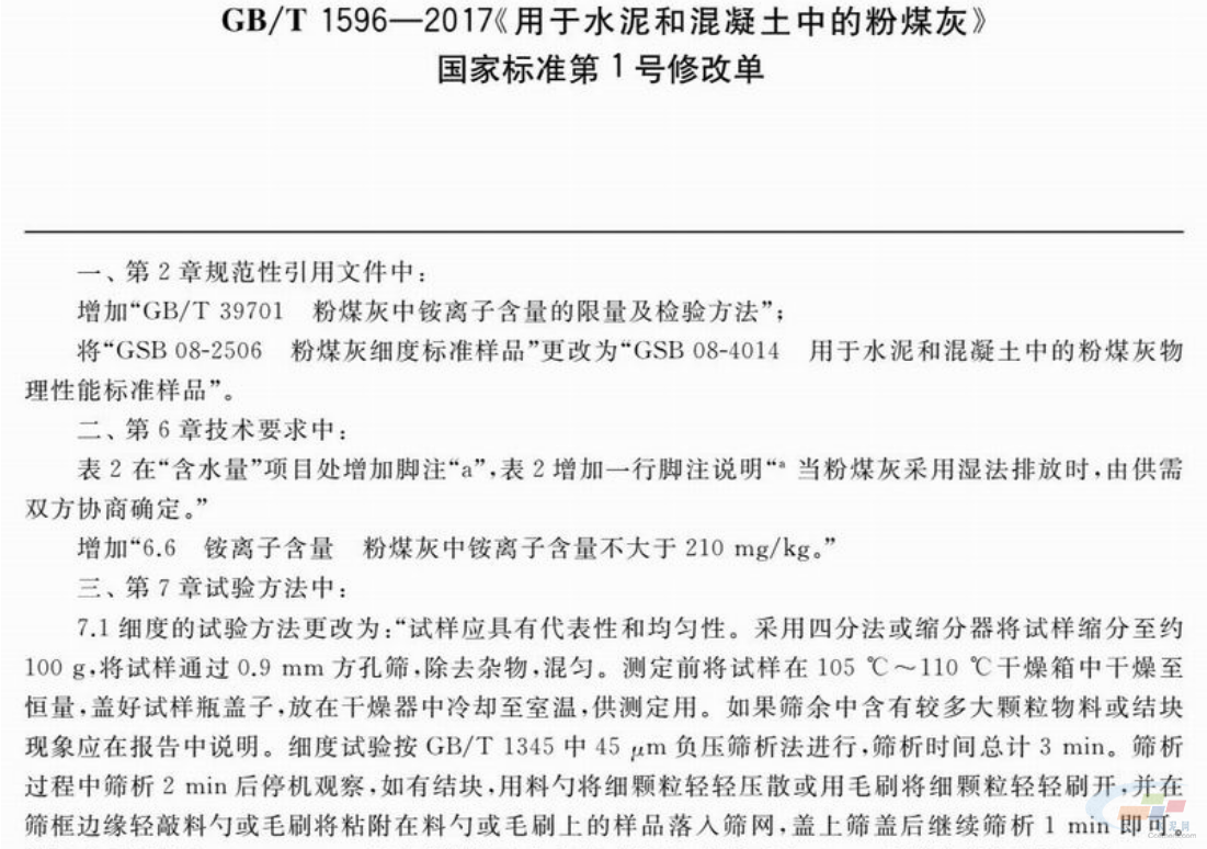 二、GB/T 1596—2017《用于水泥和混凝土中的粉煤灰》第1号修改单主要修改内容如下: